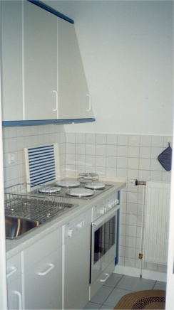 eingerichtet. Sie enthält z.B. - Geschirrspüler - E-Herd mit Heißluftbackofen - Dunstabzugshaube - Kühlschrank mit Gefrierfach und diverse Kleingeräte wie Kaffeemaschine, Toaster, Mixer, Eierkocher, Wasserkocher, Bügeleisen,... |
