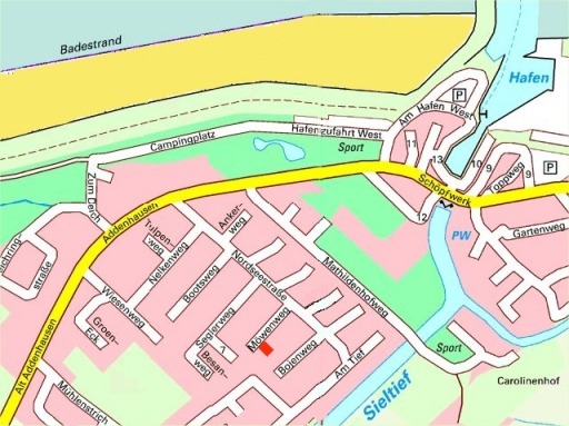 Das Haus ist ruhig gelegen am Ende einer Sackgasse. Die Entfernung zum Strand beträgt etwa 400 m und zum Hafen etwa 600 m.